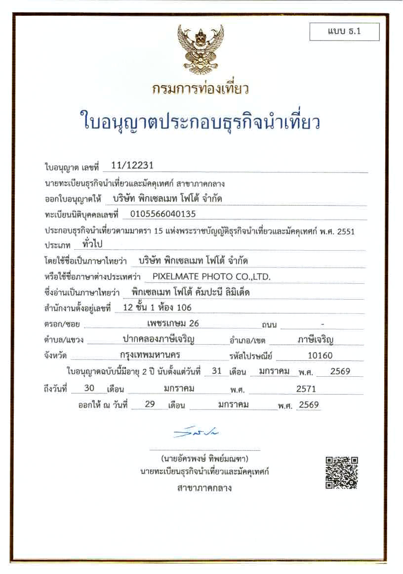 ใบอนุญาตธุรกิจนำเที่ยวเลขที่ 11/12231