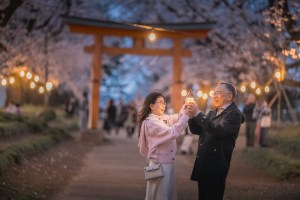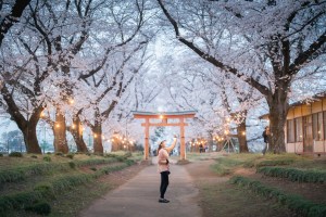 เย็น เที่ยวถ่ายภาพที่ศาลเจ้า Tenman มีซากุระปลูกสองข้างทางล้อมรอบเสาโทริอิสีแดง ช่วงกลางคืนรอถ่ายเปิดไฟ